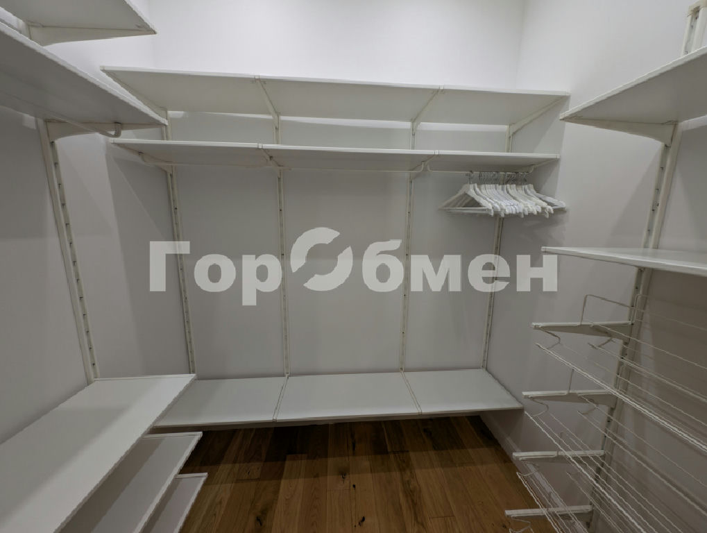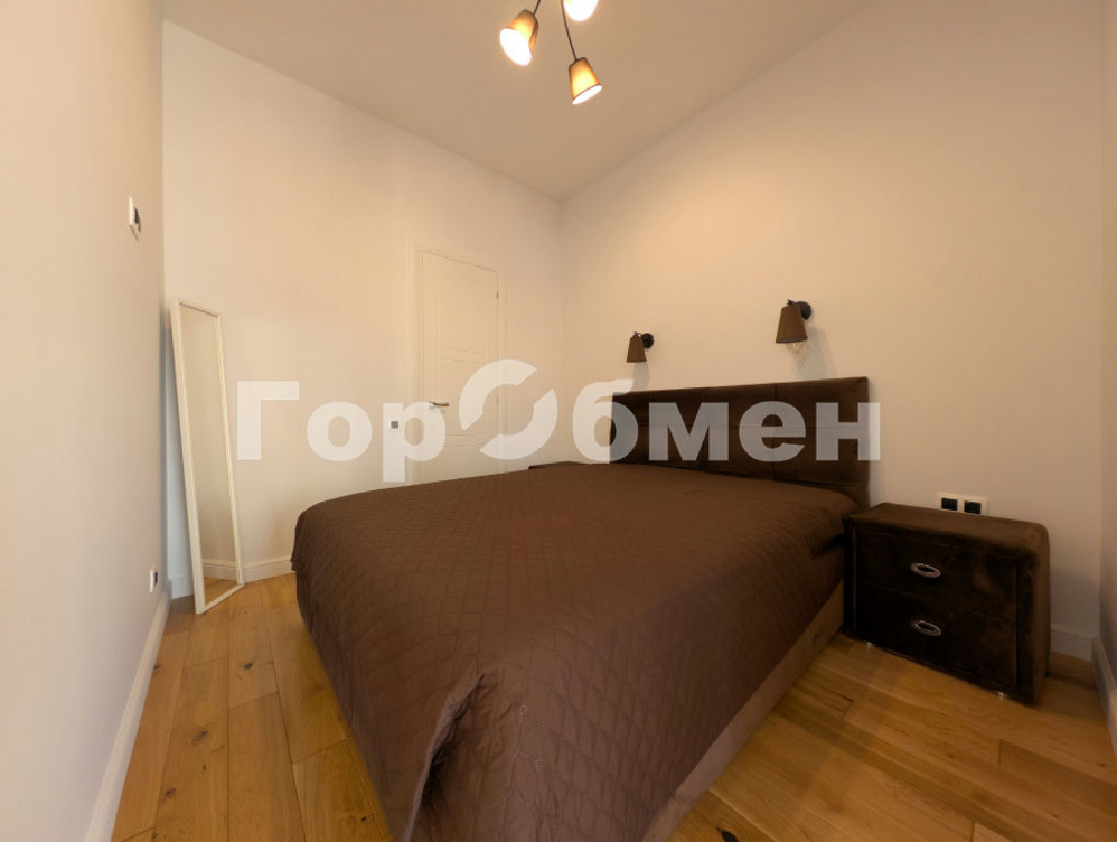Отдельная спальня с кроватью и прикроватными тумбами, зеркалом в полный рост. Плюс отдельная гардеробная комната с открытой системой хранения.